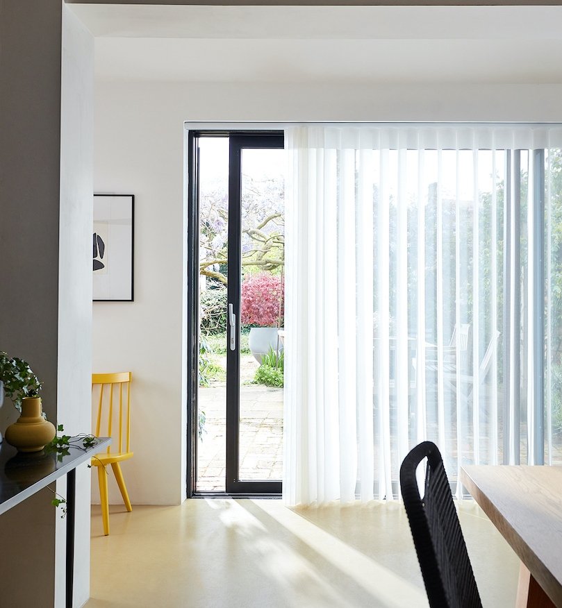 Pro Tip: Go with fabric vertical blinds for a softer look that feels more contemporary and welcoming.