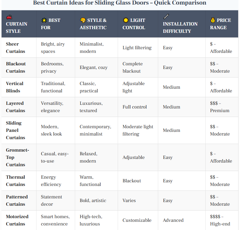 Picking curtains for sliding glass doors comes down to your taste, lifestyle, and spending plan. From breezy panels that soften sunlight, to blackout options that deliver privacy, to tech-friendly smart shades—there’s a fitting choice for every type of home and mood.
