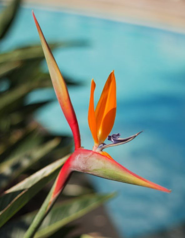Bird of Paradise stands out with its large tropical leaves and striking orange-and-blue flowers. The plant grows well in sunny areas, making it a favorite around pools in warm climates. It can reach up to six feet, adding drama and a bold look.