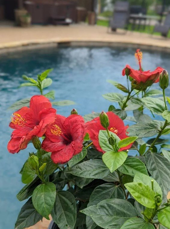 Hibiscus plants bring bright blooms in red, pink, yellow, and orange. Their colorful flowers make them one of the most attractive choices for pool landscaping. Hibiscus loves the sun and grows well in warm regions.