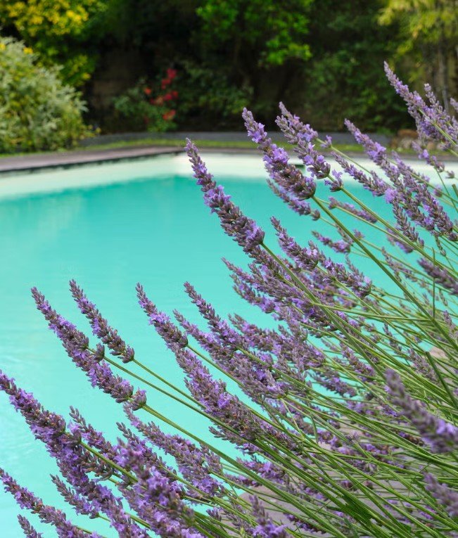 Lavender adds both fragrance and beauty to a poolside. Its purple flowers and silvery-green leaves bring soft color and a calming scent. Lavender grows best in full sun and well-drained soil.