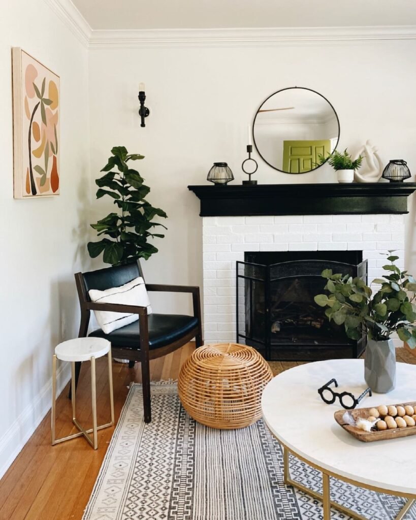 Try painting the surrounding wall white and keeping the hearth or mantel dark. This contrast adds dimension and keeps the space visually interesting. For a modern farmhouse feel, use rustic wooden furniture and soft linen textures.