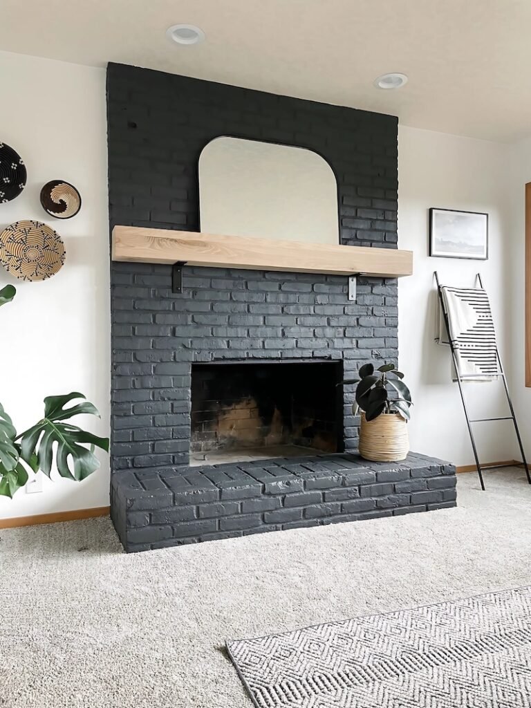 A blackwashed fireplace combines rustic charm with modern color. The blackwash technique involves diluting black paint and lightly brushing it over the brick, allowing some of the original red or white tones to show through.