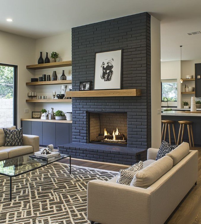 Black and white always make a classic combination. A black brick fireplace framed by white walls or trim stands out beautifully. It draws the eye and becomes the center of attention.