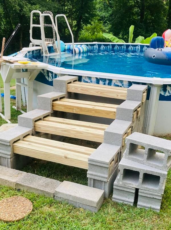 The steps can be wide enough to sit and relax while half-soaked in water. Many modern pool kits come with molded resin or fiberglass steps that attach directly to the frame.