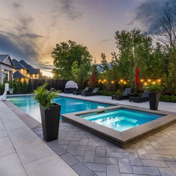 To enhance the modern vibe, homeowners often choose dark stone tiles or simple white finishes. Adding LED lighting under the water makes the pool glow in sharp patterns at night.