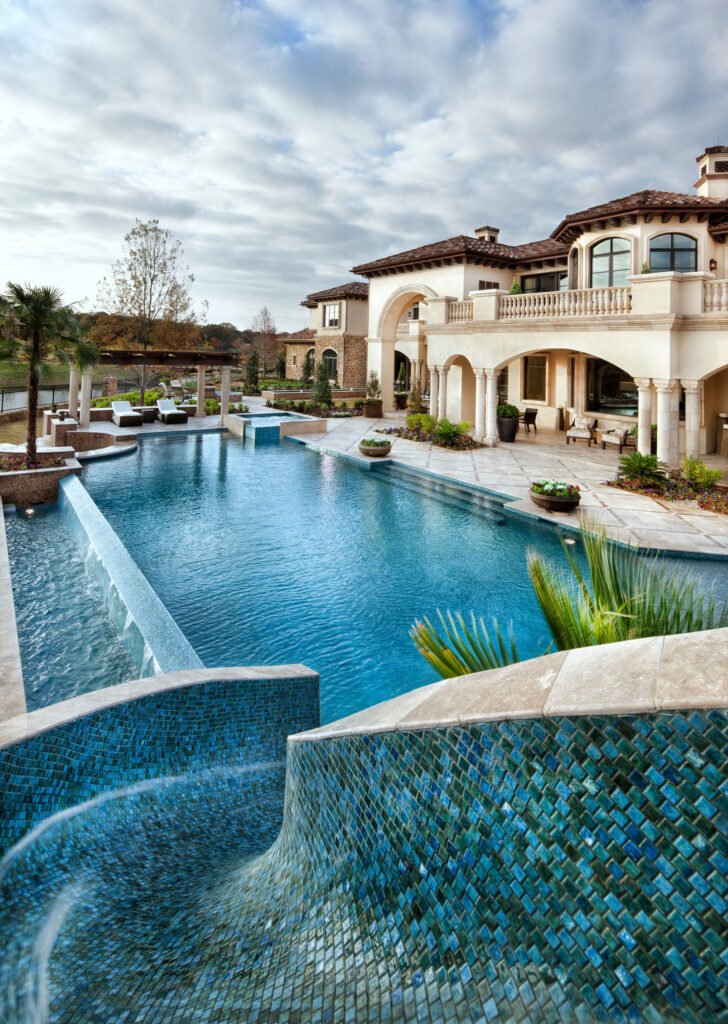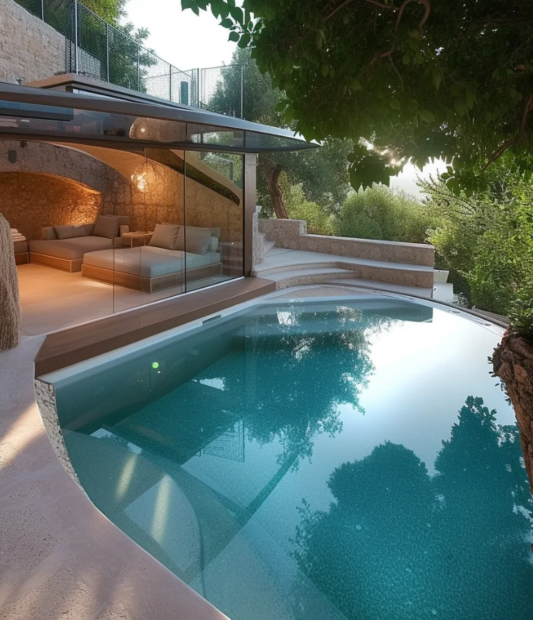 Mediterranean pools use warm tones, natural stone, and traditional details. Terracotta tiles around the pool, arched designs, and stone walls bring out the charm of Southern Europe. Blue mosaic tiles inside the pool make the water sparkle.