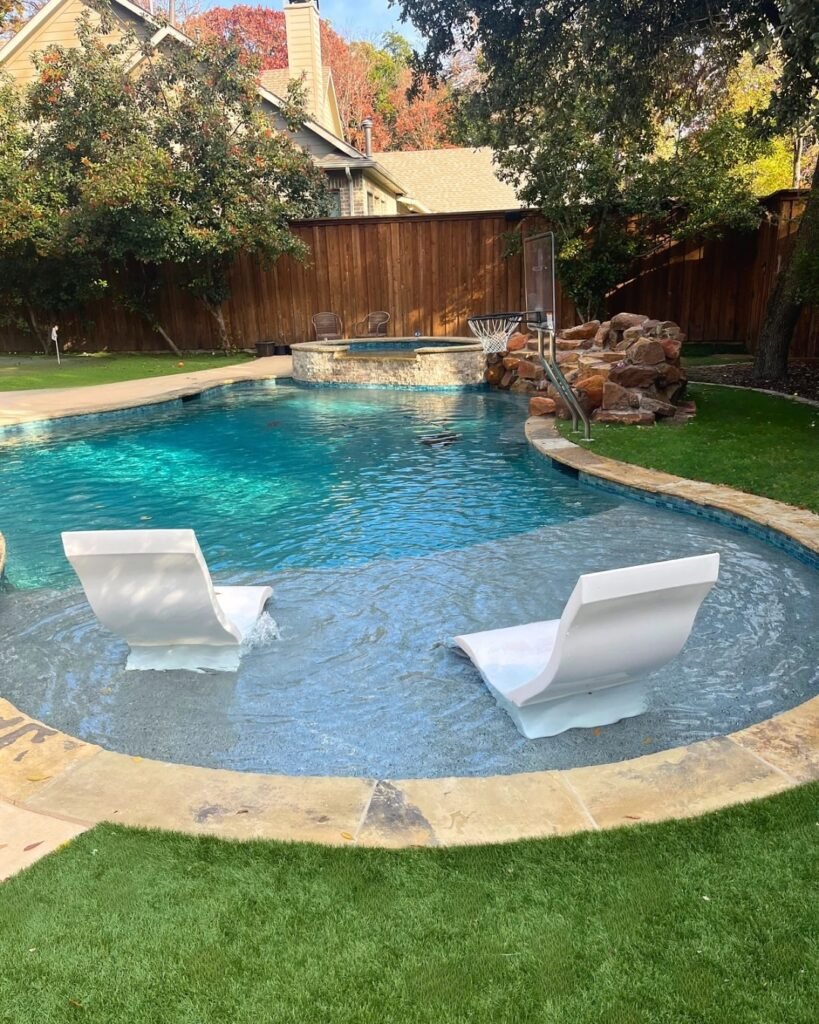 Some pools include a shallow platform designed for lounge chairs. This space allows you to sit partly in the water while reading or relaxing. Shade umbrellas or pergolas above the platform add comfort on hot days.
