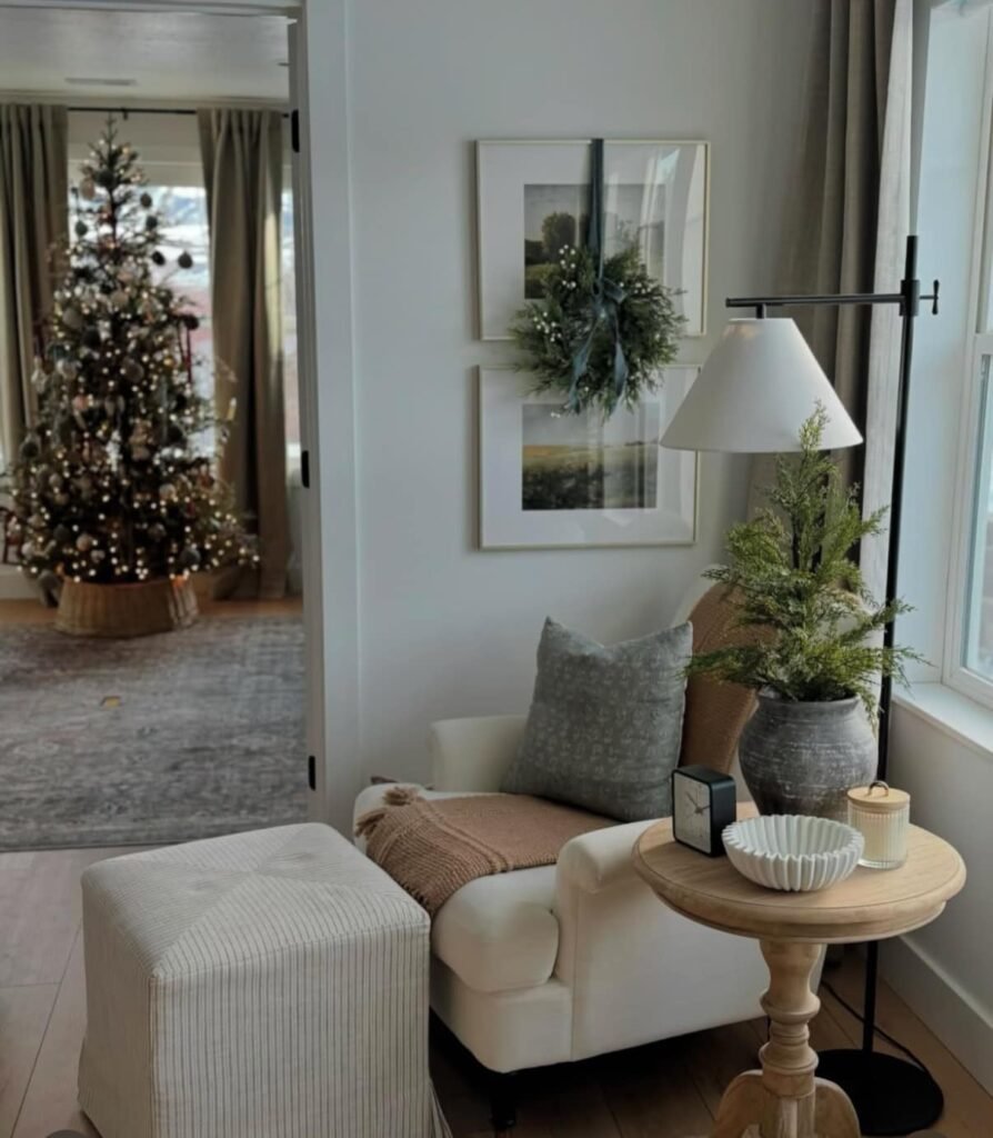 Soft neutral shades and warm leather accents shape a calm, inviting corner for the holidays. A modest wreath and gently glowing tree bring seasonal charm without excess. Every element feels intentional—balanced, comfortable, and quietly elegant, casting a subtle spell of warmth and festive ease throughout the space.