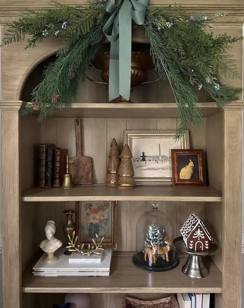 This curated cabinet brings together warm brass, natural wood tones, and touches of evergreen for a display that feels graceful and lived-in. Each shelf balances simplicity with a refined holiday touch—just enough detail to create depth without feeling crowded. The result is an inviting, collected Christmas look that feels timeless yet fresh for 2025.