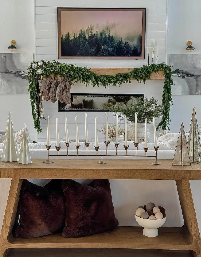 A full garland sweeps across the mantel, adding depth and warmth to the modern hearth. Layers of evergreen branches create a sense of quiet abundance, while the soft glow from nearby candles lends an ember-like light. The effect feels grounded yet festive—a gentle balance of nature and comfort that defines winter elegance.