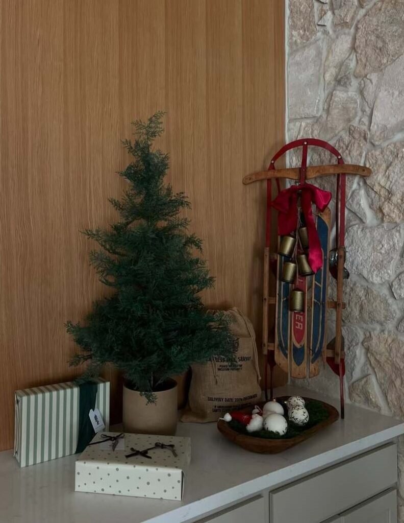 A red-runner sled and oversized bells anchor this scene with a touch of nostalgic grace. The arrangement feels effortless yet full of memory—simple pieces carrying warmth and quiet festivity. Each detail adds gentle character, turning a minimal setup into a timeless nod to classic holiday style.
