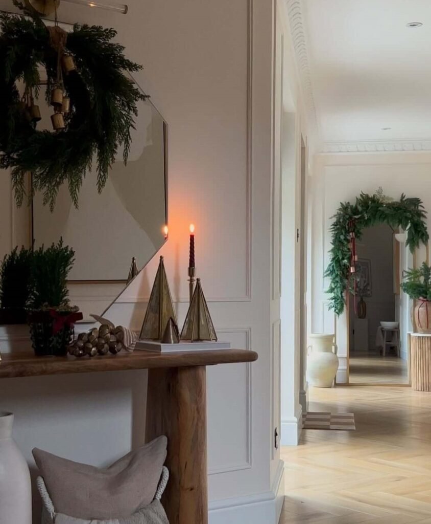 This inviting entryway pairs rustic charm with refined accents, where cedar sprigs, brass trees, and soft candlelight create an atmosphere of quiet warmth. The glow of flickering tapers adds depth and texture, turning a simple space into a graceful holiday welcome. Each detail feels thoughtful yet effortless—a balance of nature, light, and timeless seasonal style.