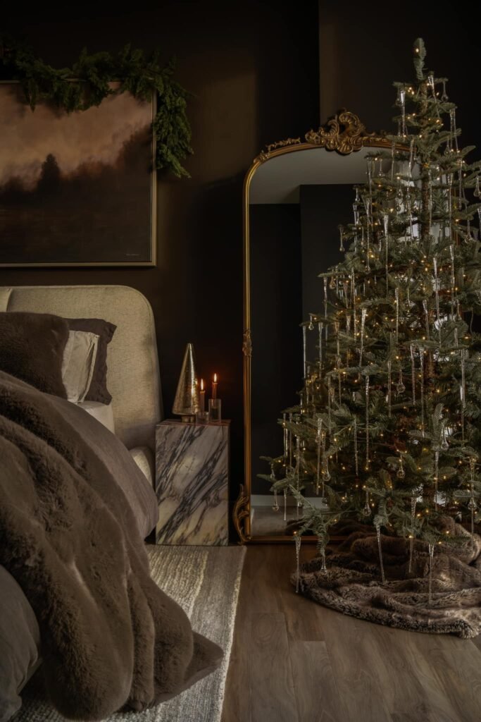 Glass icicles glint like frozen rain, reflecting gentle candlelight across a dim, elegant backdrop. Deep tones anchor the scene, while subtle shimmer brings a refined festive touch. The atmosphere feels calm yet indulgent—an understated expression of holiday luxury that glows softly as night settles in.