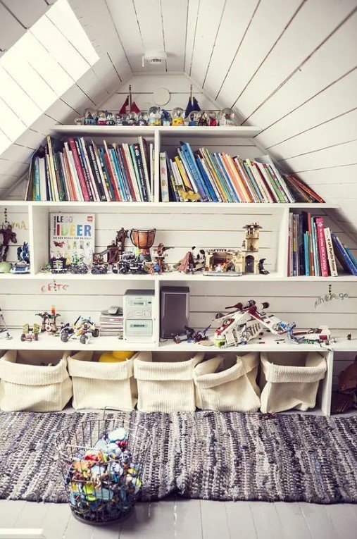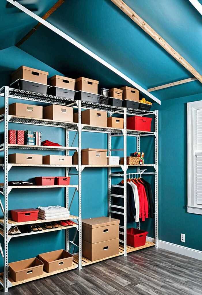 Wall shelves can make the best use of attic walls, especially under slanted ceilings. They hold boxes, books, and decorations without taking up floor space.