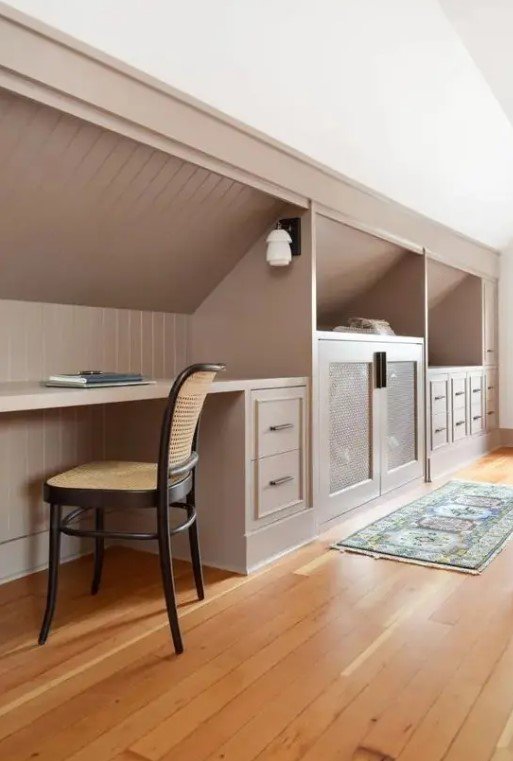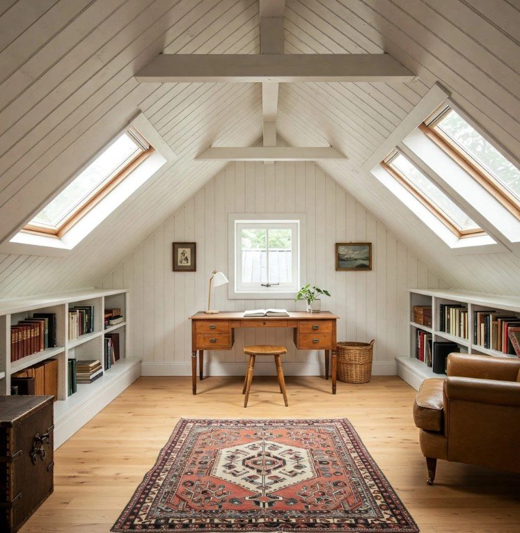 Every attic is different, with beams, angles, and slopes. Custom-built storage makes use of these unique shapes. Hire a carpenter or use DIY skills to create fitted cabinets or cubbies that follow the roof’s design.