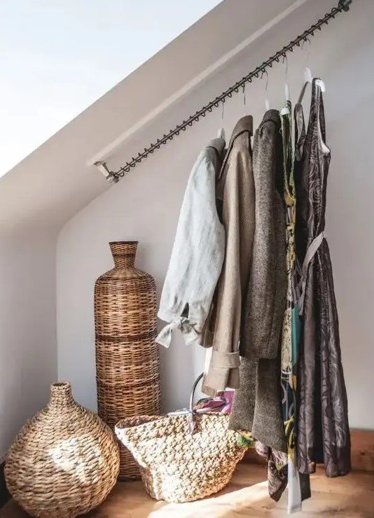 Attics make great spots for extra clothing storage. A hanging rod or two can turn the space into a mini wardrobe. Secure the rod between beams or under a slanted wall. Then hang off-season clothes, coats, or fancy outfits you don’t wear often.