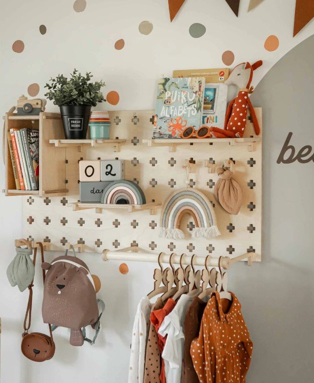 A pegboard gives flexible and visible storage. Attach one to a free wall and use hooks or small shelves for tools, craft supplies, or accessories. Change the layout anytime by moving the hooks around.