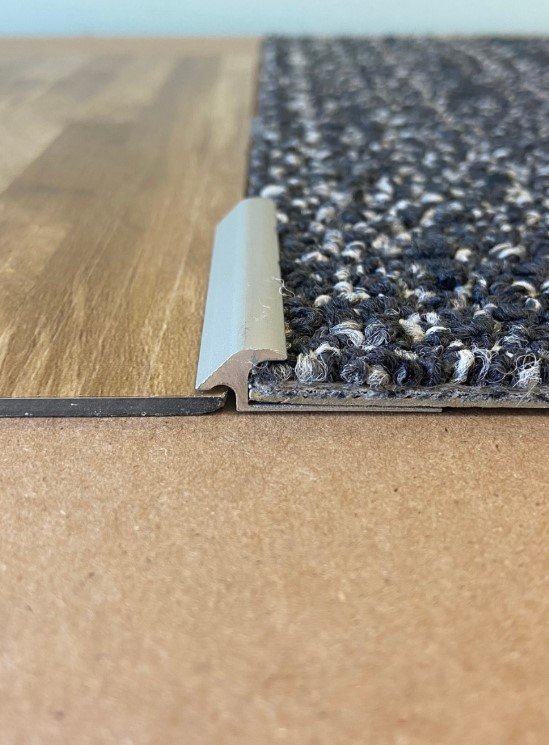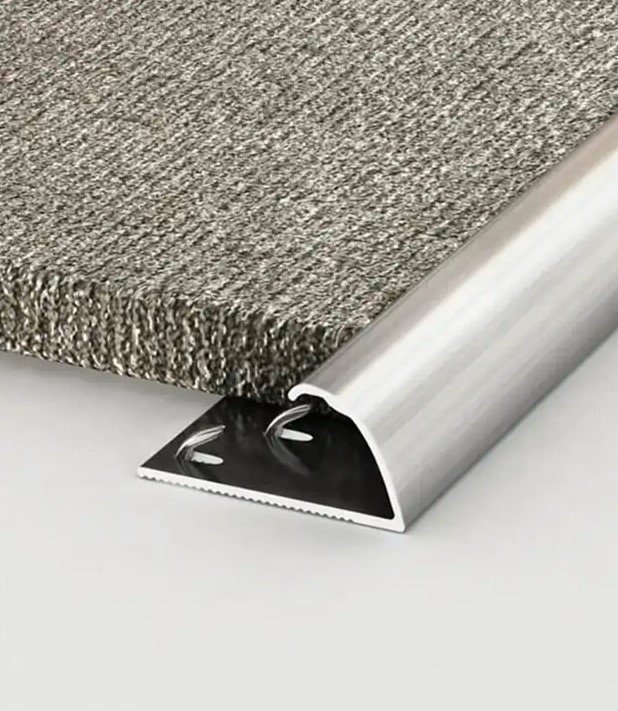 End cap strips finish the edge of the carpet where it meets a hard floor. They are often used in doorways and room corners. The flat part sits on the hard floor, while the angled part covers the carpet edge.