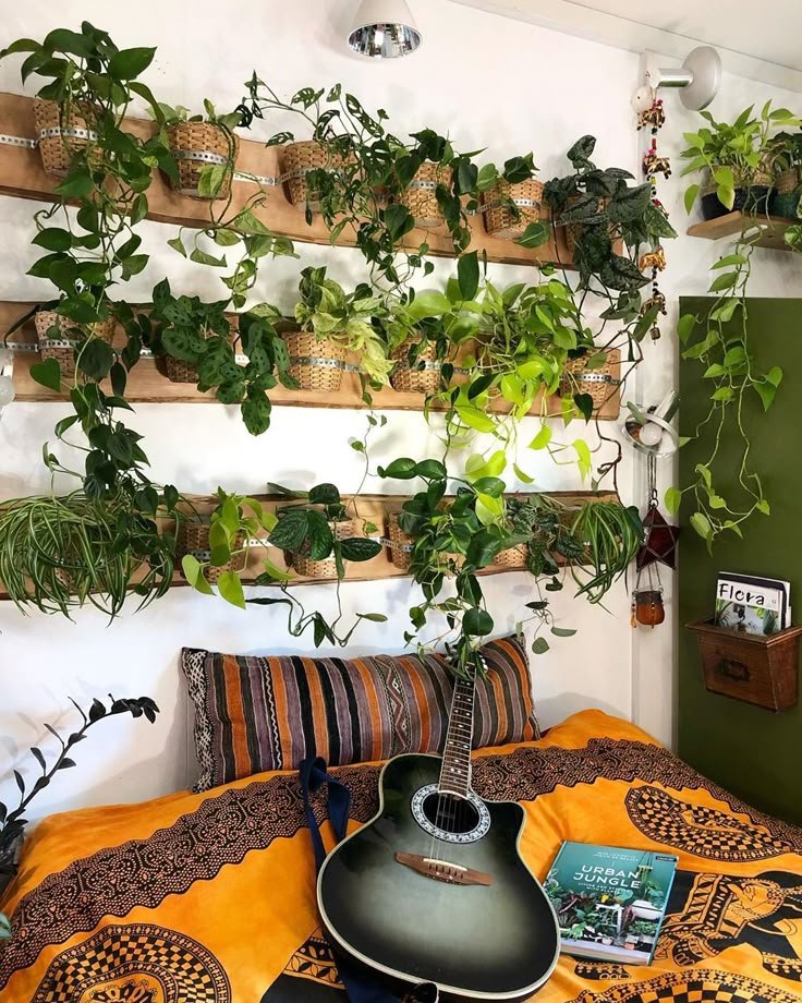 Arrange plants in a row above your desk or hang them in corners. They add color, improve air quality, and give a peaceful feeling.