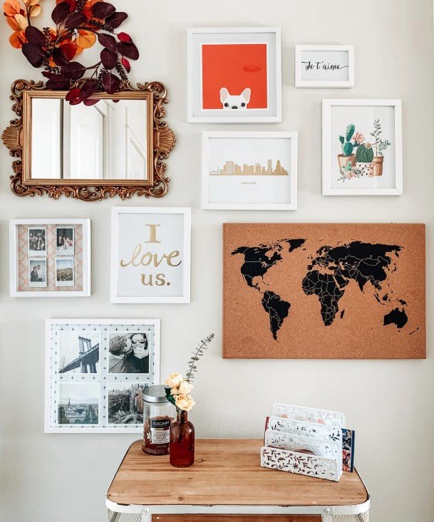 A gallery wall combines different pieces into one creative display. You can mix photos, art prints, quotes, postcards, and even small mirrors.