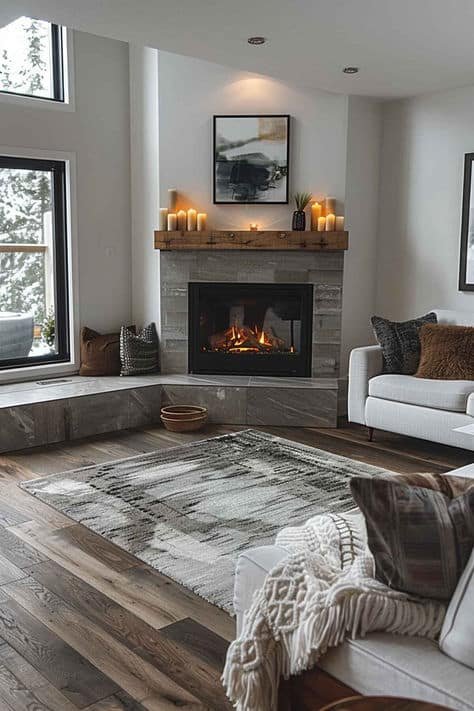 This setup makes the corner feel like a small reading nook or resting spot. It’s perfect for small homes where every inch matters. The warmth from the fire makes the seat even more inviting.