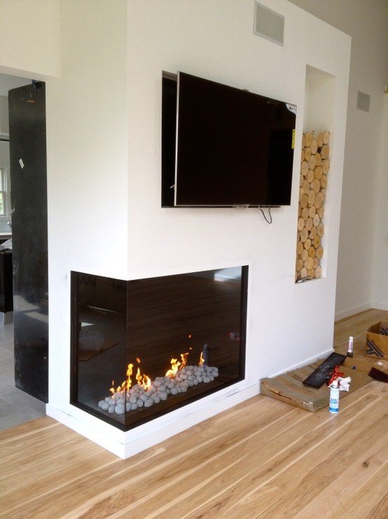 Many people like to place a TV above their corner fireplace. It saves space and creates one clear focal point. An electric unit is safe and easy to install. It also gives off heat without needing a chimney.