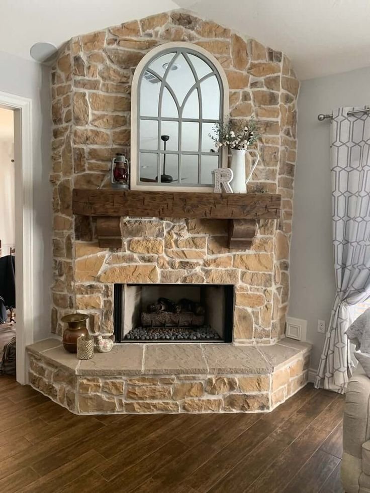 Add a wooden mantel to complete the rustic feel. Place a few woven baskets beside it for blankets or firewood. This idea feels especially cozy in a cabin-style home or any space that needs a touch of nature indoors.