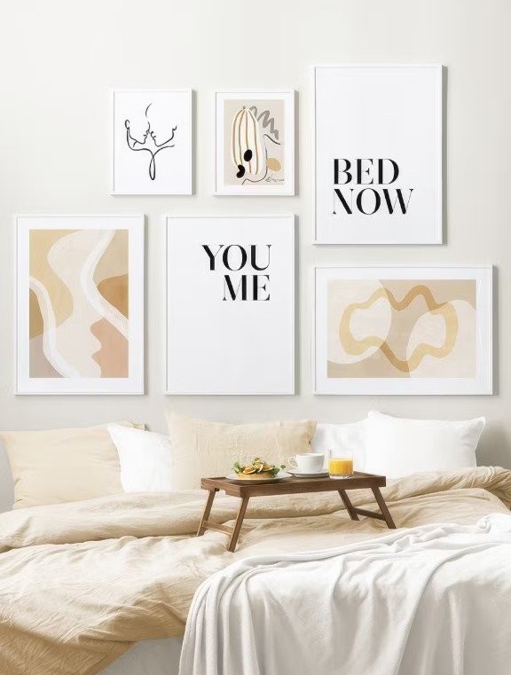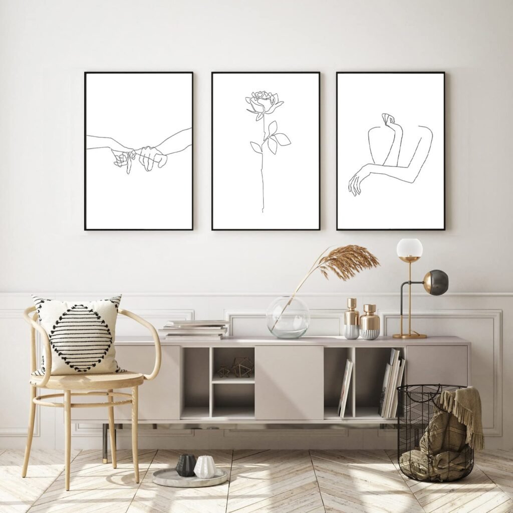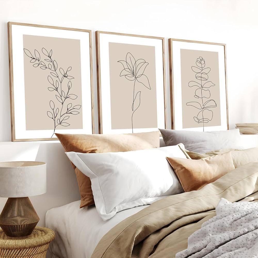 This style suits Scandinavian, modern, or minimalist bedrooms. Place one or two large line drawings above the headboard for elegance. Smaller sets of two or three framed line prints look balanced when hung vertically or side by side.