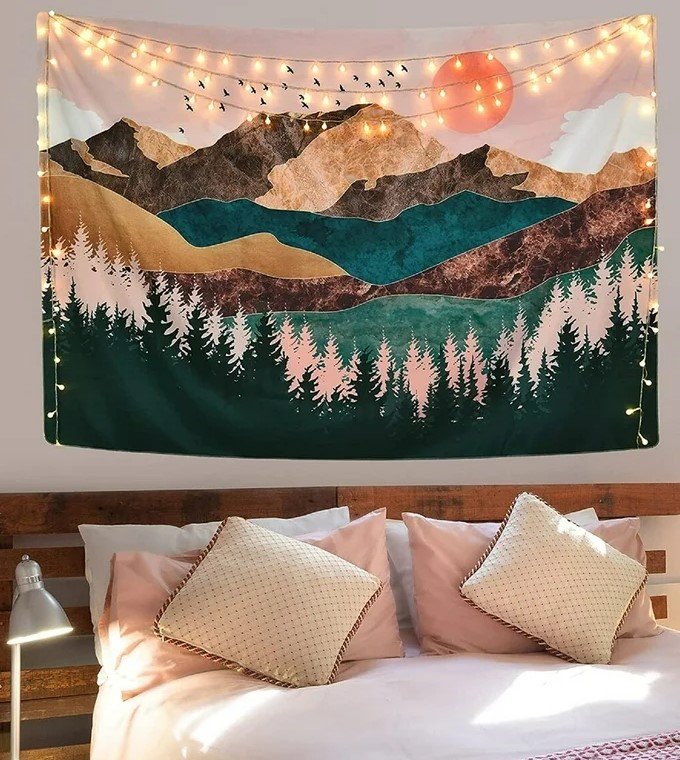 For placement, hang one large tapestry above the headboard or let it cover an entire wall. Use a wooden dowel or rod for a clean and secure hanging style. In smaller rooms, pick lighter fabrics and colors to prevent the space from feeling heavy. For extra layering, place fairy lights behind the tapestry for a soft glow at night.