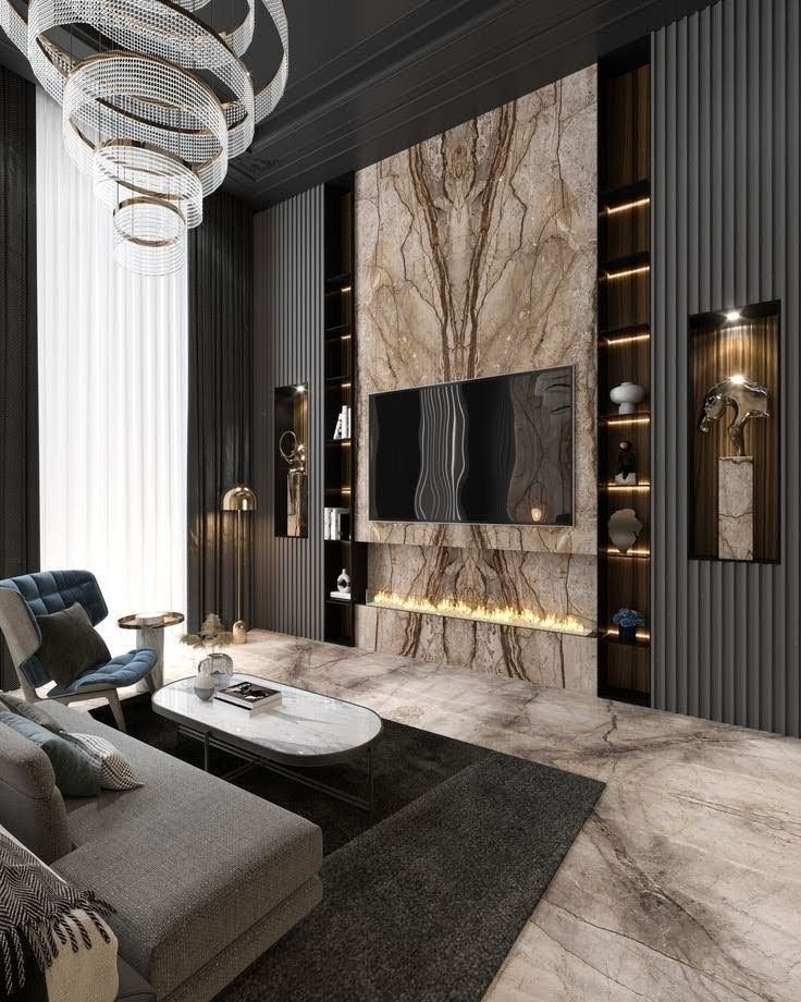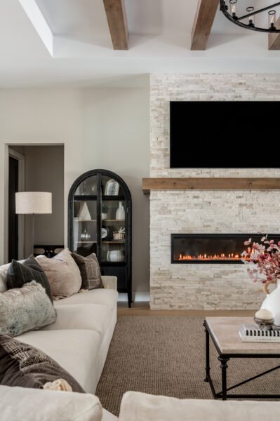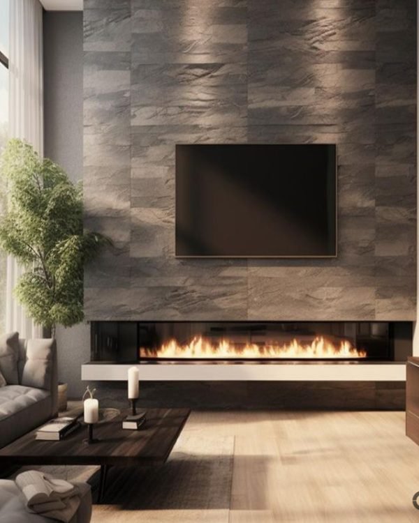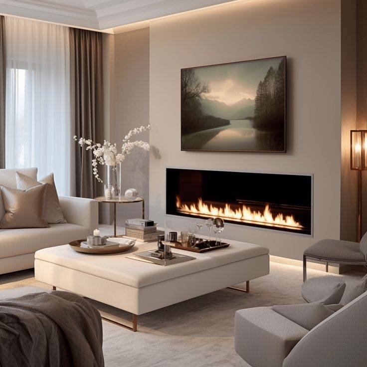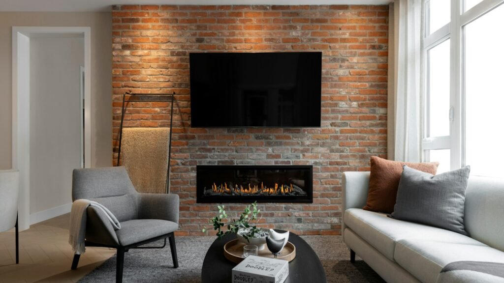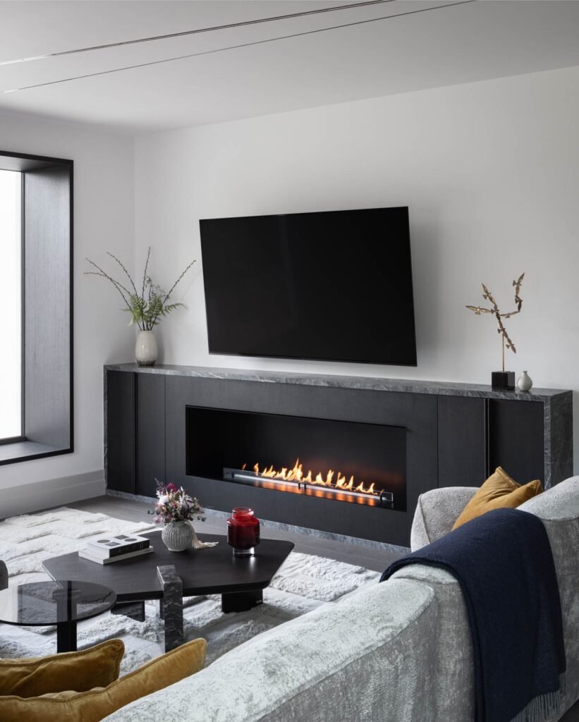 An electric fireplace brings warmth and atmosphere, while mounting a TV above creates a seamless focal point. This pairing combines comfort with practicality, turning one wall into both a source of relaxation and entertainment.