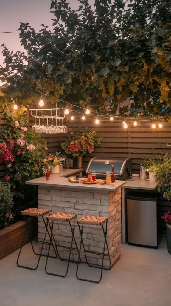 Good lighting makes every gathering feel inviting. String lights, lanterns, or even solar-powered lamps can cast a gentle glow that sets the mood. Add cushioned seating or textured throws for a touch of comfort, encouraging guests to linger longer. A few potted plants or herbs nearby bring a natural accent, completing your outdoor bar with freshness and warmth.