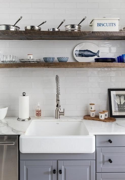 Open shelving offers both practicality and visual grace. Curate a mix of everyday essentials and decorative accents that harmonize in tone and material. By maintaining thoughtful spacing, the shelves stay orderly while enhancing light flow throughout the kitchen. The combination of antique hardware and natural wood subtly ties together the farmhouse aesthetic with understated sophistication.