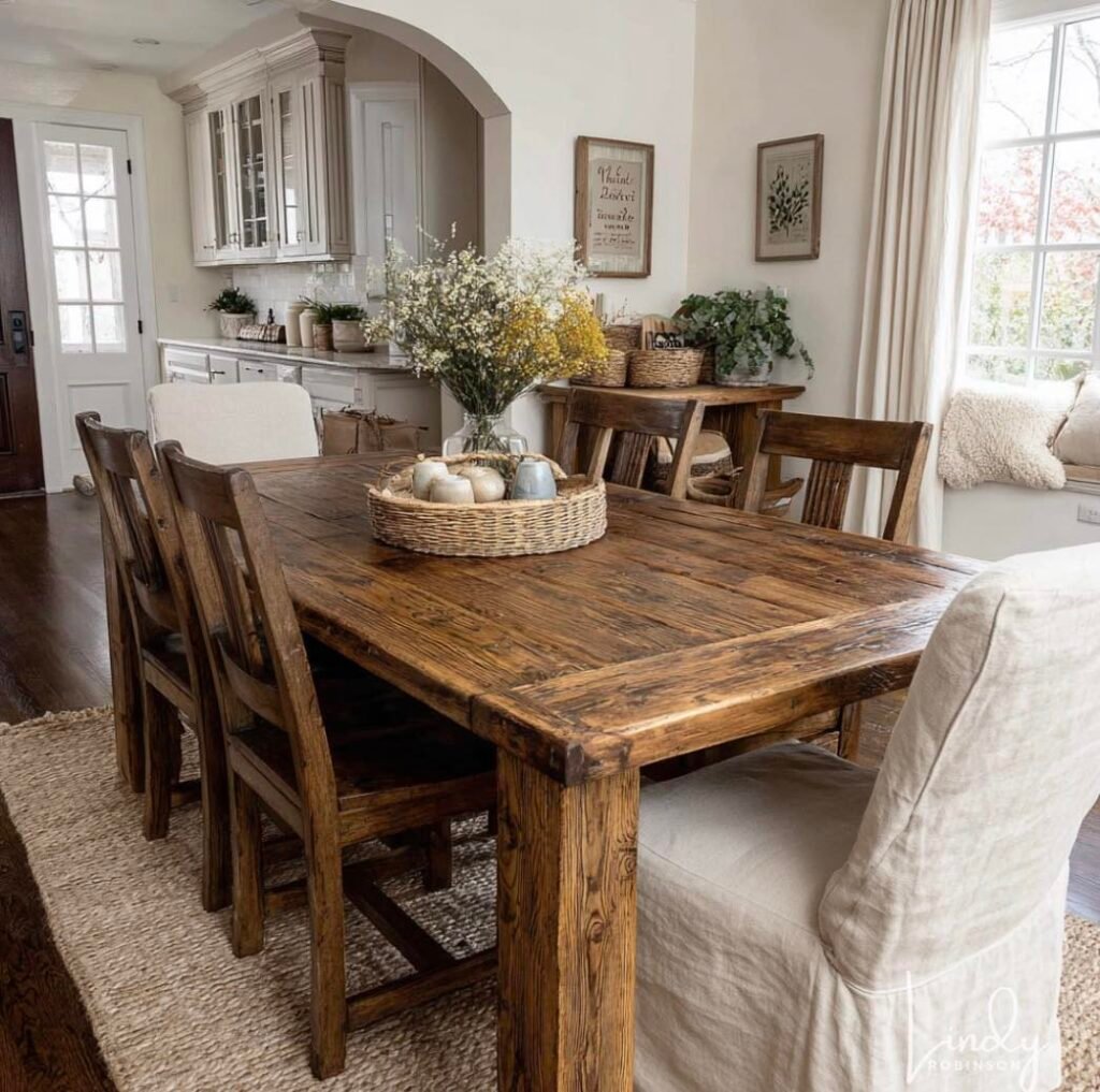 A rustic dining table crafted from reclaimed oak, maple, or pine instantly becomes the gathering point of a farmhouse kitchen. Its weathered surface and visible grain tell a quiet story of age and craftsmanship, anchoring the space with warmth and strength. This centerpiece invites conversation, shared meals, and a sense of familiarity that defines country living.