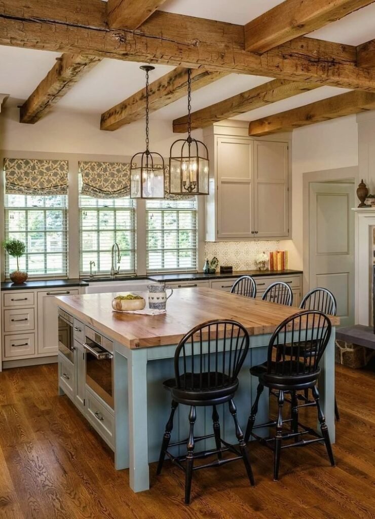 Add sheer linen curtains or soft cotton drapes to temper the light and introduce a vintage whisper to the design. This pairing strikes a balance between rustic structure and graceful softness, giving the kitchen a lived-in elegance that feels timeless rather than staged.