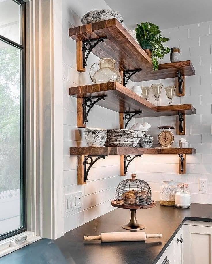 Swap out upper cabinets for open wooden shelves supported by ornate antique brackets to introduce character and function in equal measure. This approach celebrates simplicity while keeping the kitchen feeling spacious and inviting. The aged patina of iron or brass brackets pairs beautifully with reclaimed or stained wood, creating a timeless balance between strength and charm.