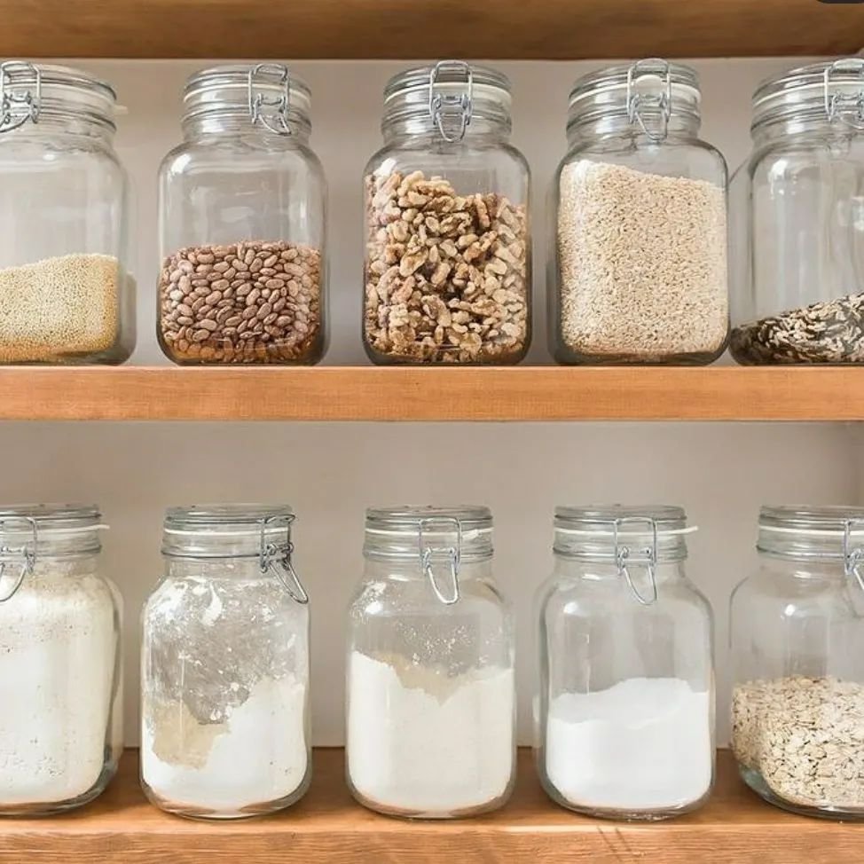 Store pantry staples—grains, pasta, spices, or beans—in clear glass jars placed neatly on open shelves or countertops. Their transparency creates harmony and order while making everyday items easily accessible. The subtle gleam of glass reflects light beautifully, giving the kitchen a calm and organized appearance with a timeless farmhouse character.