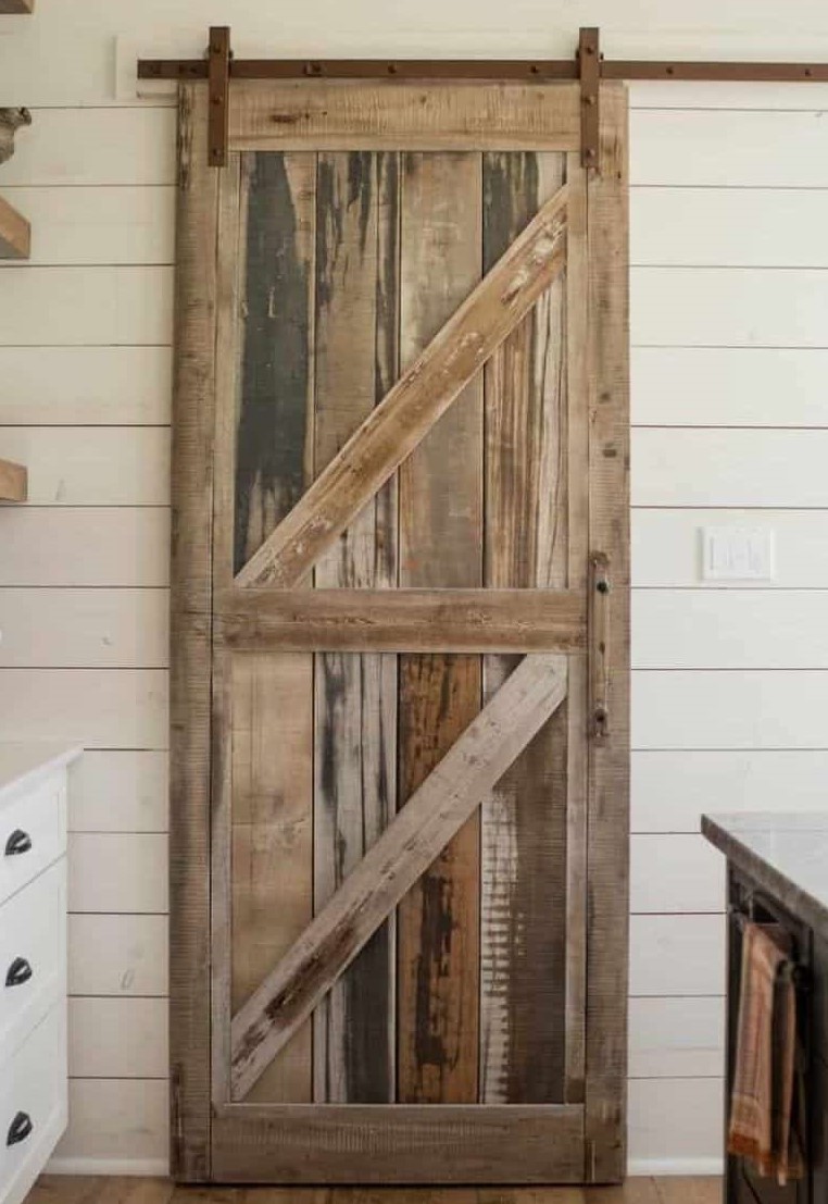 Bringing an antique barn door into a pantry setup introduces a worn-in charm that feels rich with past life and texture. Its aged boards, uneven tones, and timeworn surface give the kitchen a grounded presence that blends smoothly with modern farmhouse styling.