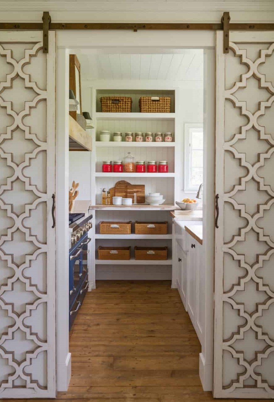 The lattice creates a decorative accent that still allows glimpses of jars, baskets, and other pantry pieces. This mix of visibility and subtle coverage adds charm and keeps your storage looking intentional and tidy.