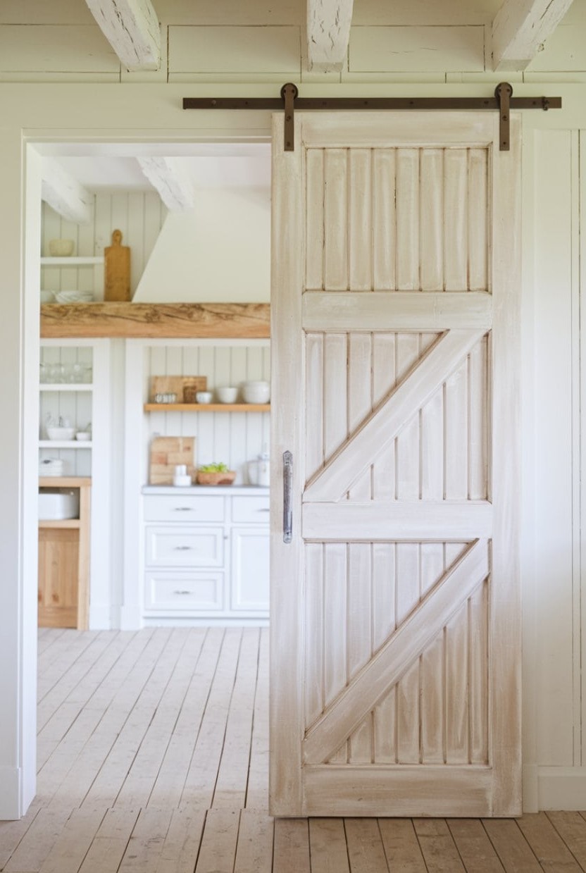A whitewashed wooden door brings a breezy, open feel to a pantry entrance, giving the kitchen a gentle lift without calling too much attention to itself. Its softened tones brighten the area and add quiet texture that suits a farmhouse mood.
