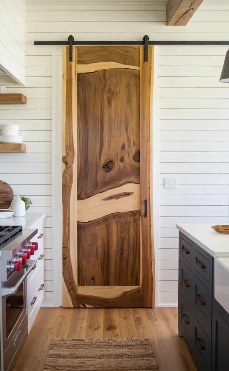 Crafted from natural wood that keeps its raw, flowing edges, this pantry door draws attention to the beauty of organic materials. The irregular outline gives the doorway a bold, earthy presence that fits smoothly into a farmhouse kitchen without feeling overly refined.