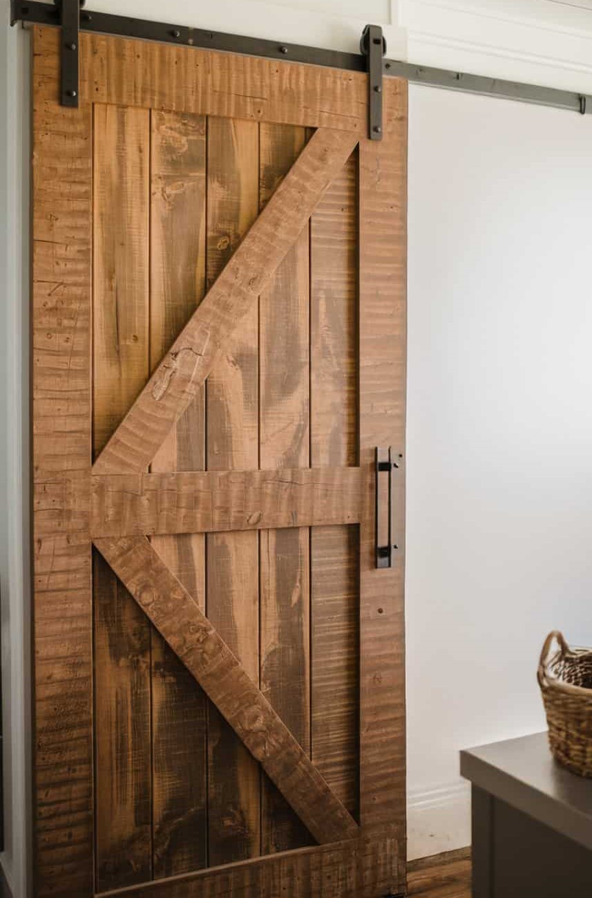 This textured barn door brings depth and a bold presence to your kitchen, giving the pantry entrance a standout look through raised grain, carved lines, or layered wood patterns. Its surface adds movement and interest without feeling overwhelming.