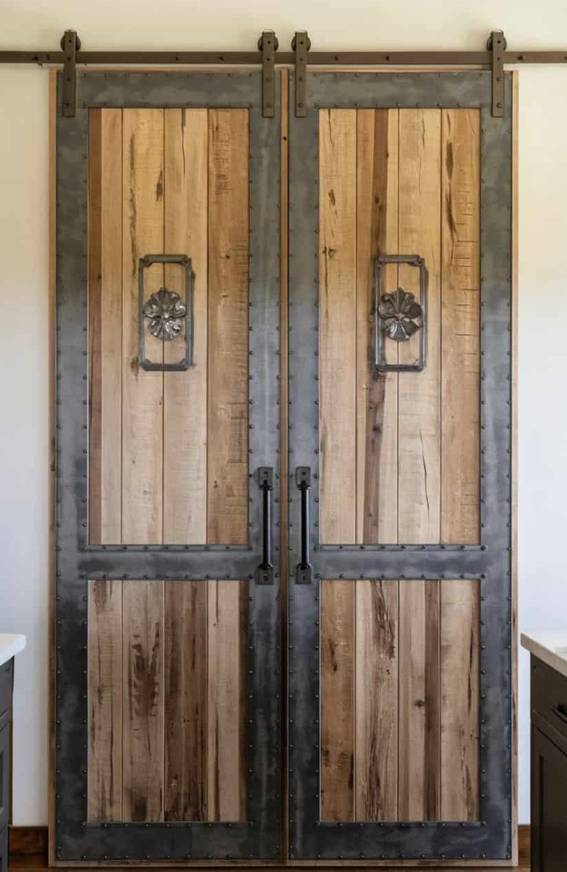 This pantry door blends reclaimed wooden panels with rugged metal elements, forming a bold mix that feels grounded and full of character. The contrast between warm grain patterns and cool metal tones gives the doorway a confident presence without drifting into excess.