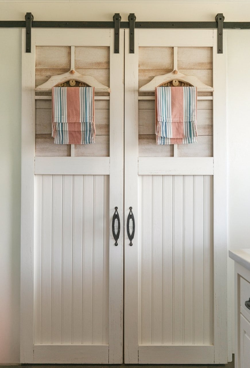 Painting the panels in a soft shade—like muted sage, warm cream, or a pale blue—adds a friendly tone that blends smoothly with rustic surfaces and natural materials. The result is a pantry entrance that feels welcoming, steady, and pleasantly understated.