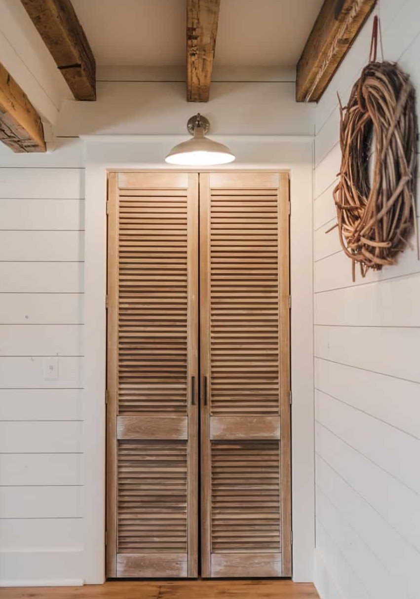 Homes with a country lean can paint the shutters in a muted shade or keep the natural finish to spotlight the wood’s grain and irregular marks. Either approach creates a pantry entry that feels warm, functional, and quietly character-filled.