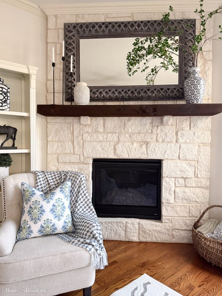 A mirror above the mantle adds depth and light to a room. It reflects natural light during the day and makes the space feel larger. A mirror also adds balance to your decor.