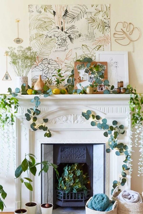Greenery brings color and energy to your space. It softens the hard lines of wood or stone around the fireplace.