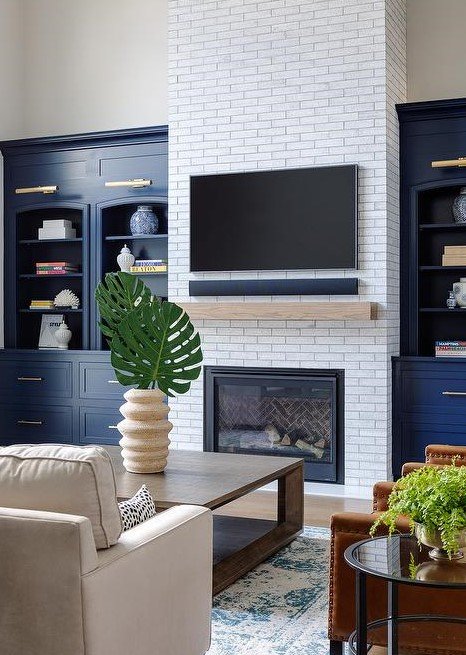Be captivated by the striking charm of a white brick fireplace framed by deep blue cabinets. This refined design infuses your living room with elegance and calm, creating a space that feels both stylish and soothing.