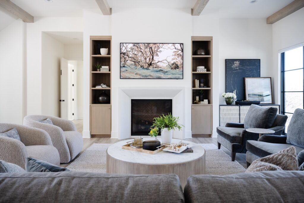 A fireplace can do more than just heat your space—it can anchor your entire living room design. Built-ins surrounding the fireplace add both personality and purpose, turning blank walls into areas that feel intentional and balanced. Mix open shelving with closed cabinets for a clean, layered look. Display your favorite books, ceramics, or framed art while keeping cords and clutter hidden below. Using subtle contrasts—like light oak shelves paired with a darker mantel—creates depth without overpowering the room.