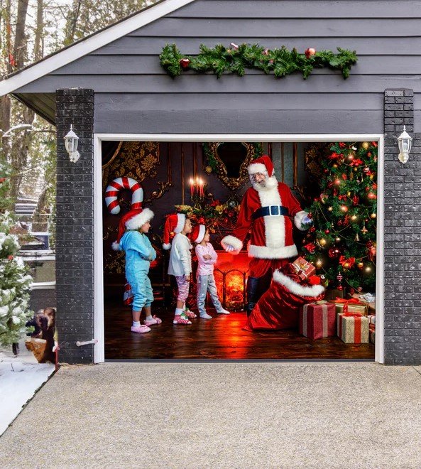A large mural or vinyl wrap can turn your garage door into a holiday masterpiece. Many stores sell festive covers showing Santa’s sleigh, snowy villages, or reindeer scenes. They stick easily and remove without damage.